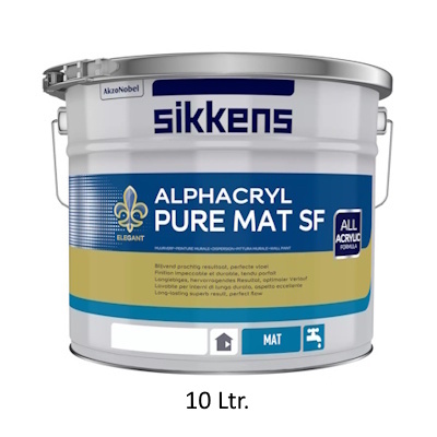 Sikkens Alphacryl Pure Mat SF is een extreem matte, schrobvaste, oplosmiddelvrije binnenmuurverf. Hierdoor is de verf uitermate geschikt voor ruimten met invallend strijklicht. Omdat Alphacryl Pure Mat SF spanningsarm en isolerend is, is de verf ook zeer geschikt om te gebruiken bij renovaties.